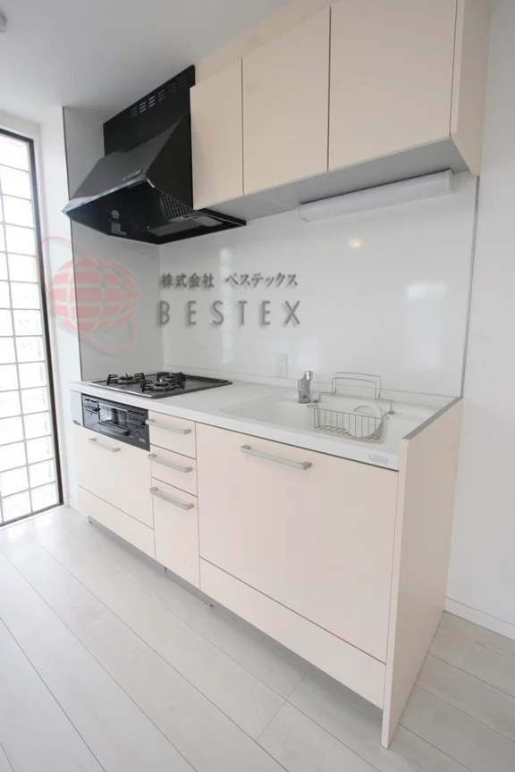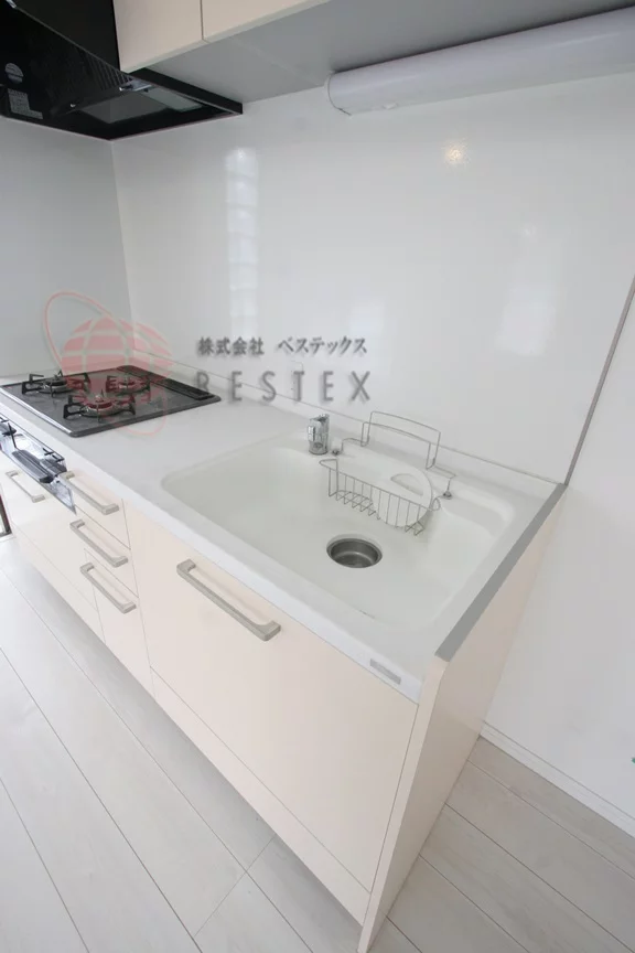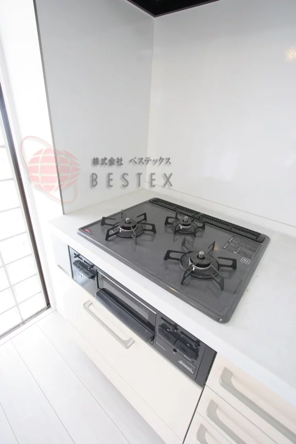 キッチンは3口ガスコンロが備わったシステムキッチンで、収納が多いので調理器具をたくさんお持ちの方でも安心してお使い頂けます。